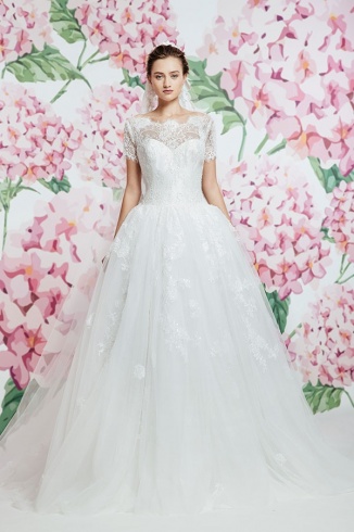 Most of the wedding dresses are off the shoulder dresses or have transparant sleeves, adding a feminine and romantic look.