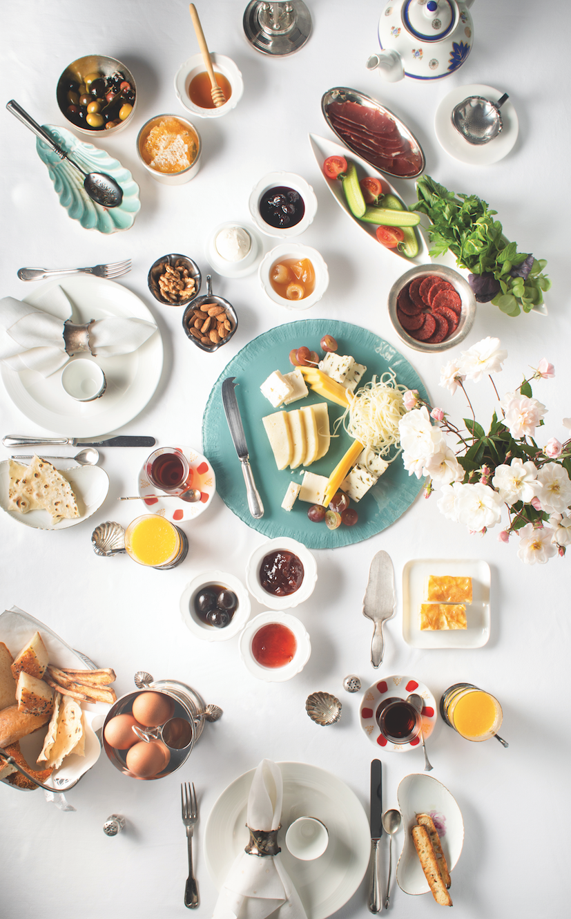 Accompanied by fragrant Turkish tea served in tulip-shaped glasses, a typical Turkish breakfast will often consist of freshly baked bread and simits, a crunchy, circular bread covered with sesame seeds, along with the celebrated serpme (spread), which can include menemen, an egg dish made with tomatoes and peppers, as well as fresh cucumbers, tomatoes, peppers and leafy vegetables, various cheeses, green and black olives, honey, kaymak (a Turkish rendition of clotted cream), jams, butter, and acuka, a spicy tomato- and pepper-based spread.